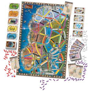 1 tablero de Europa del Norte, 200 Vagones de tren de colores, 114 cartas de Vagón, 55 cartas de Billete de Destino, 11 cartas de Objetivo común, 5 Marcadores de Puntuación, 1 Libro de reglas