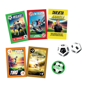 151 cartas, 3 tableros, 3 fichas de Balón, 9 fichas de Gol, 2 dados de 12 caras (Tiro y Despeje), 9 fichas de Cambio, 1 reglamento