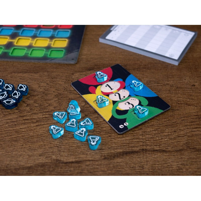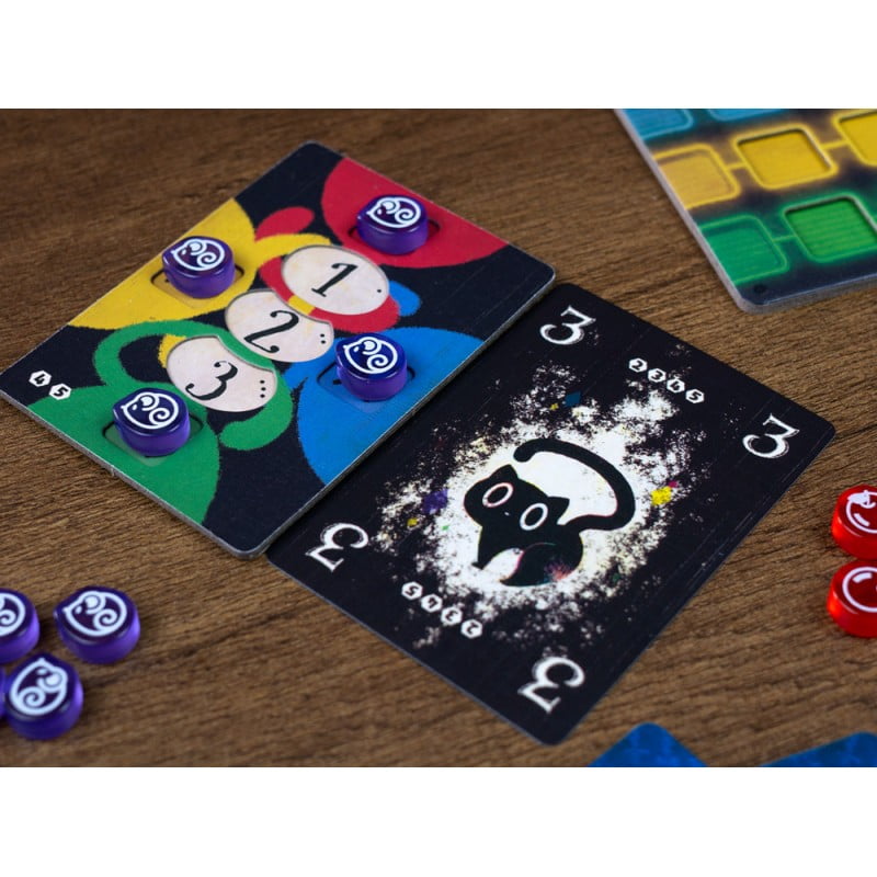 Cat in the Box no es un juego de bazas cualquiera, ya que anuncias el color de cada carta únicamente al jugarla. Sin embargo, cada combinación de número y color solo se puede jugar 1 vez. Así que ten cuidado: si no puedes jugar más cartas, causarás una paradoja y ¡perderás puntos!